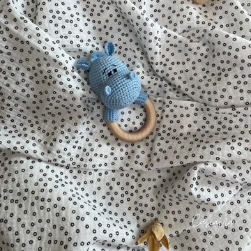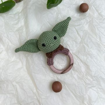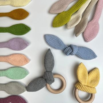 Чудовий варіант першої іграшки для малюка. Вушка сплетені з приємної на дотик пряжі (напівбавовна), в середині яких є шуршалка (харчова плівка). Зав'язані на ідеально зашліфоване, кільце, без покриття.